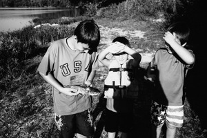 Three boys gather around a recently caught fish, their expressions a mix of excitement and awe under the bright sunlight. The black-and-white composition emphasizes the contrast between light and shadow, highlighting their youthful innocence. The serene backdrop of the lake adds a sense of adventure and nostalgia to this moment of childhood discovery.