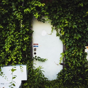 A weathered white door stands framed by a lush tapestry of green vines and leaves, creating an enchanting sense of mystery. The soft, natural light illuminates the scene, enhancing the contrasts between the vibrant foliage and the faded door. The composition invites curiosity, suggesting untold stories that lie beyond this verdant threshold.