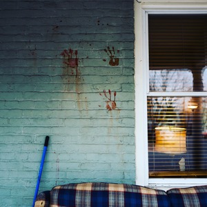 This photograph captures a hauntingly intimate scene, where smudged handprints on a faded teal wall hint at a tumultuous history. The contrasting warmth of a lamp glowing through a nearby window adds a touch of melancholy, while the blue cleaning tool leans against a muted plaid couch, suggesting remnants of an attempt to erase memories. The overall mood is one of eerie nostalgia, evoking curiosity and unease about the stories held within these walls.