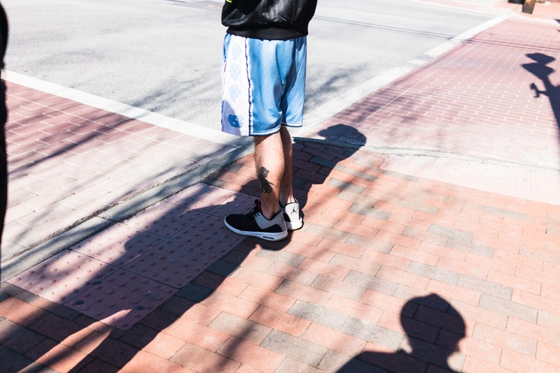 A lone figure stands at a crosswalk, clad in vibrant blue shorts and sneakers, exuding a relaxed, casual vibe. The strong sunlight casts distinct shadows on the textured pavement, enhancing the minimalist yet striking composition. This snapshot captures an everyday moment, filled with the warmth of a sunny day and the anticipation of movement.