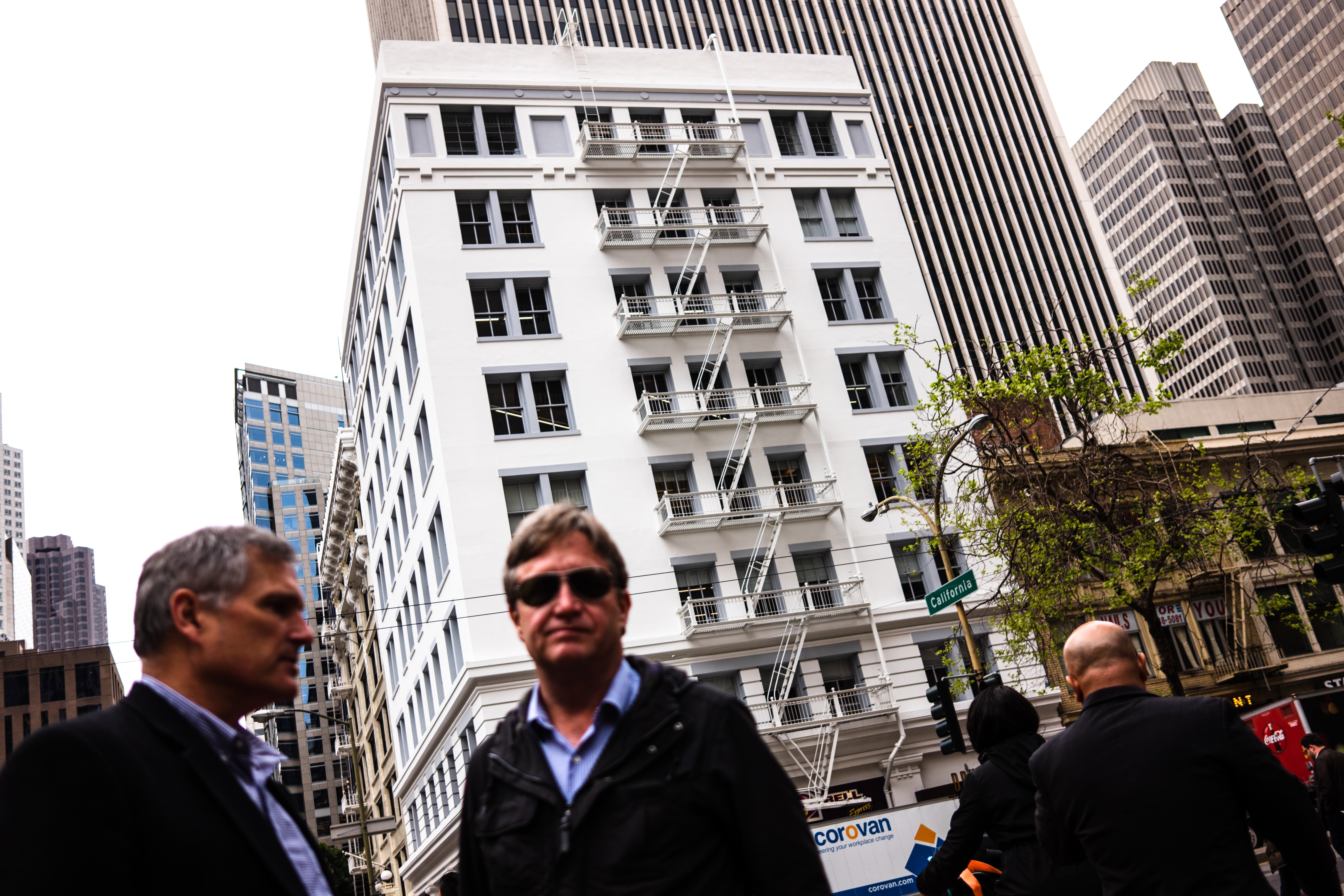 This photograph captures a bustling urban scene with two men in the foreground, one wearing sunglasses, creating a sense of intrigue. The imposing, modern architecture in the background contrasts with the historic white building, highlighting the dynamic intersection of old and new. Soft, overcast lighting lends a muted mood that enhances the sense of movement and urban life.