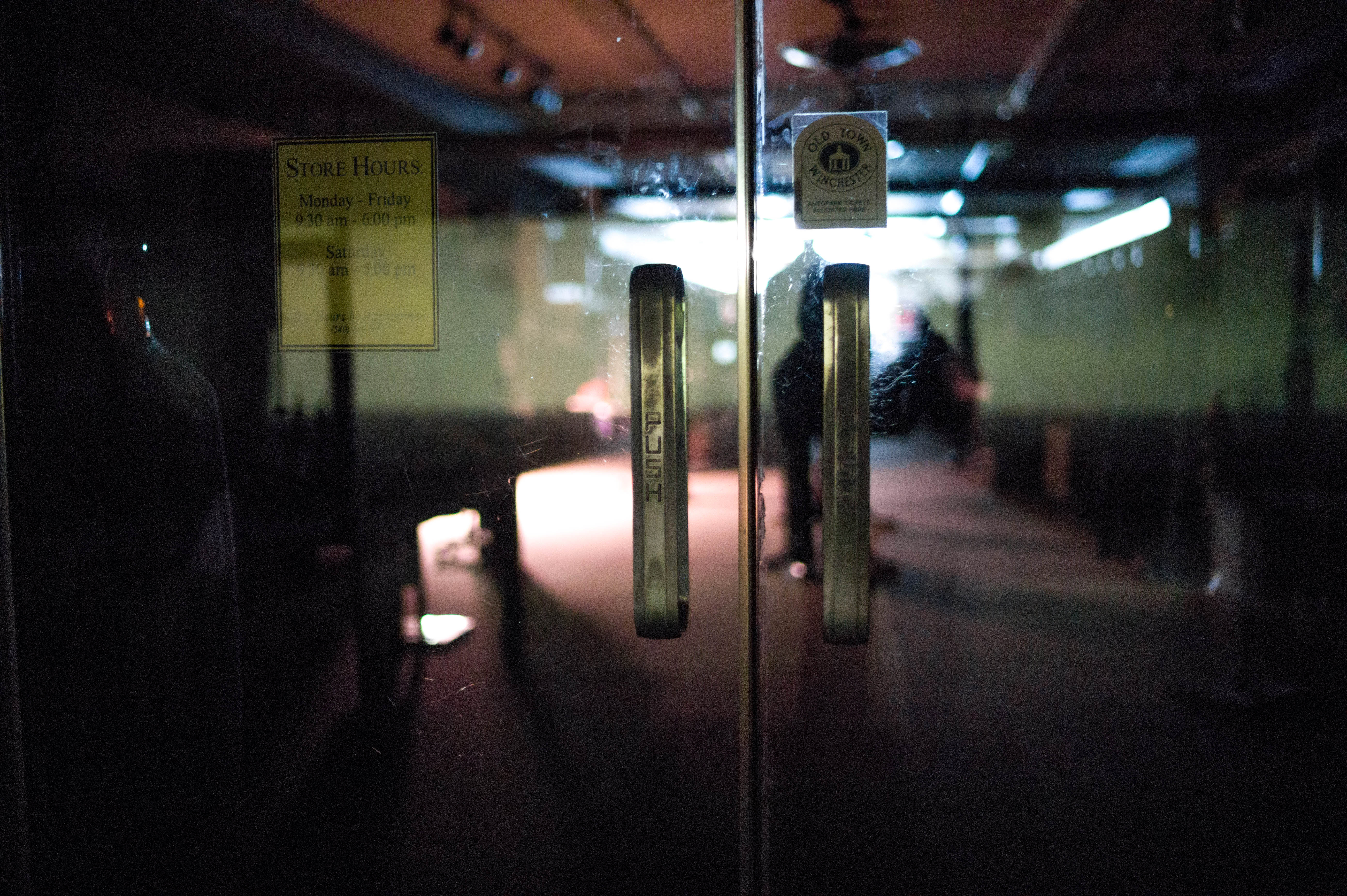 This photograph powerfully captures the view through glass doors, where the warm glow of indoor lighting contrasts with the shadowy figures beyond. The mood is a blend of mystery and anticipation, inviting the viewer to contemplate what lies within. Reflections and textures add depth, creating a compelling composition that draws the eye to the interplay of light and shadow.