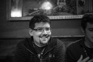 In a cozy, dimly lit setting, a man is caught mid-laugh, his eyes sparkling behind glasses. The soft focus and monochromatic tones enhance the warm, inviting atmosphere, while the blurred figure beside him hints at a relaxed, social moment. The composition highlights his cheerful expression against a backdrop of rustic charm.
