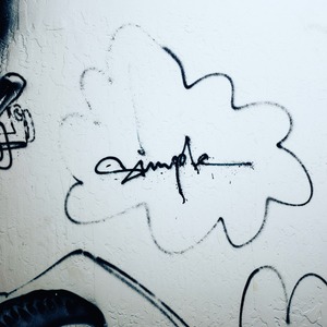 A striking piece of graffiti features the word 'simple,' elegantly scrawled in bold black against a textured white wall. The cloud-like outline adds a whimsical touch, inviting contemplation amidst an urban backdrop. The composition is graphic and minimalistic, evoking a sense of calm simplicity in a chaotic environment.