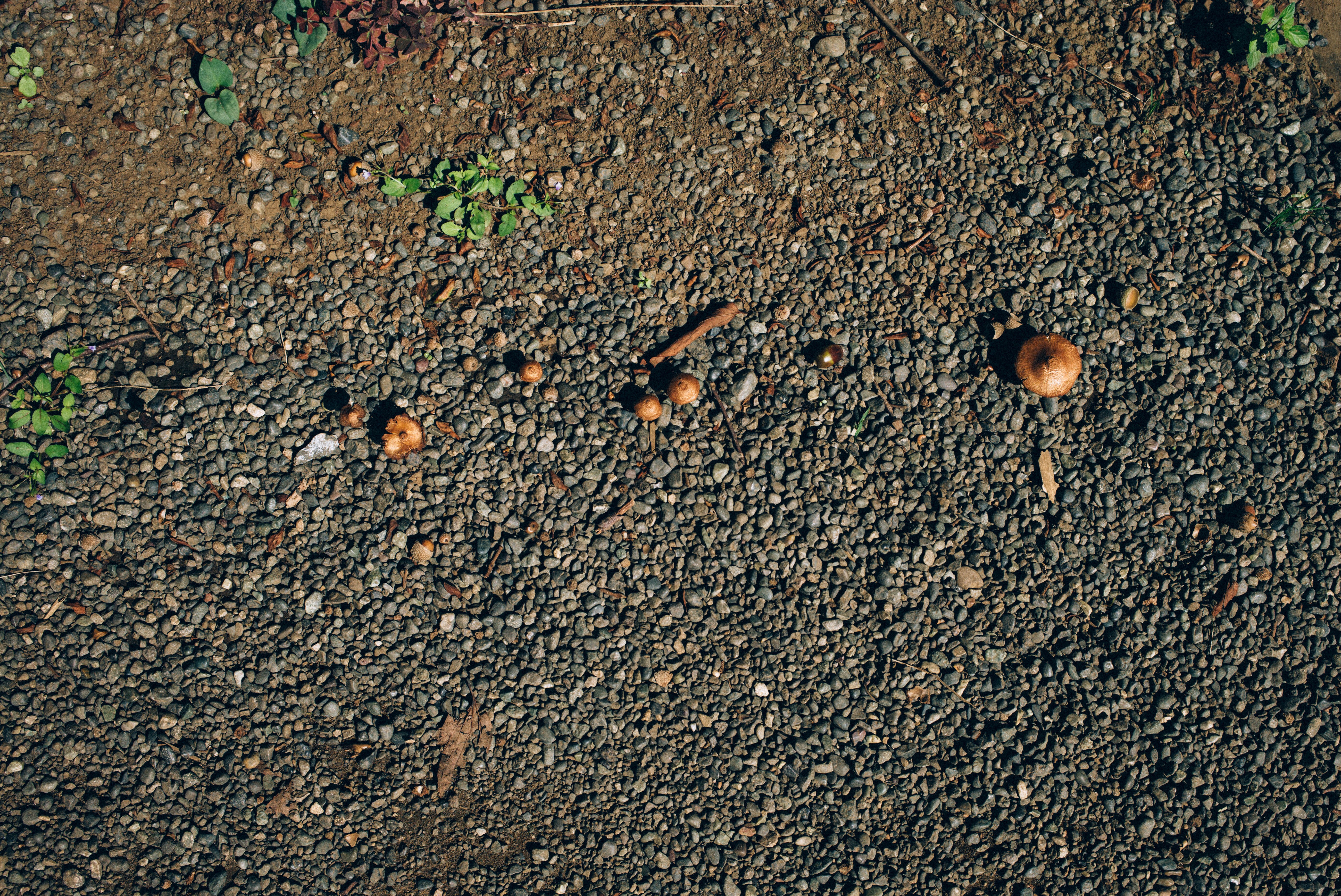 This photograph captures a serene arrangement of mushrooms nestled among pebbles and dirt, inviting a sense of quiet exploration. The soft, natural light illuminates the fungi, highlighting their earthy tones and textures against the rugged landscape. The composition, featuring a linear progression of mushrooms, evokes a sense of harmony and organic beauty in the natural world.