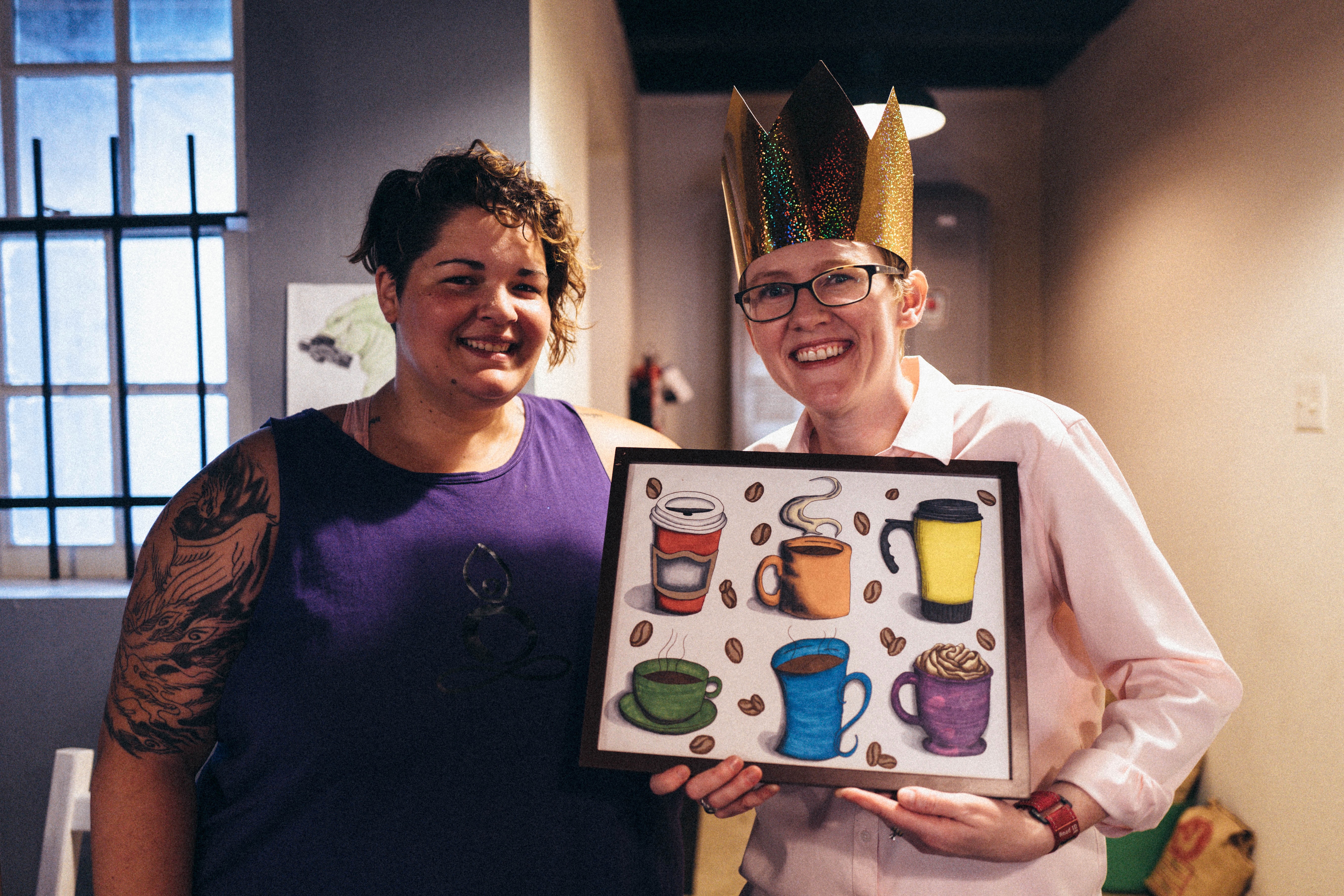In this lively photograph, two friends share a joyful moment, each exuding warmth and camaraderie. The centerpiece, a colorful artwork of coffee mugs, symbolizes their shared interests, while the soft, ambient lighting enhances the cheerful atmosphere. The playful golden crown atop one friend’s head adds a whimsical touch, contrasting beautifully with the room’s muted tones.