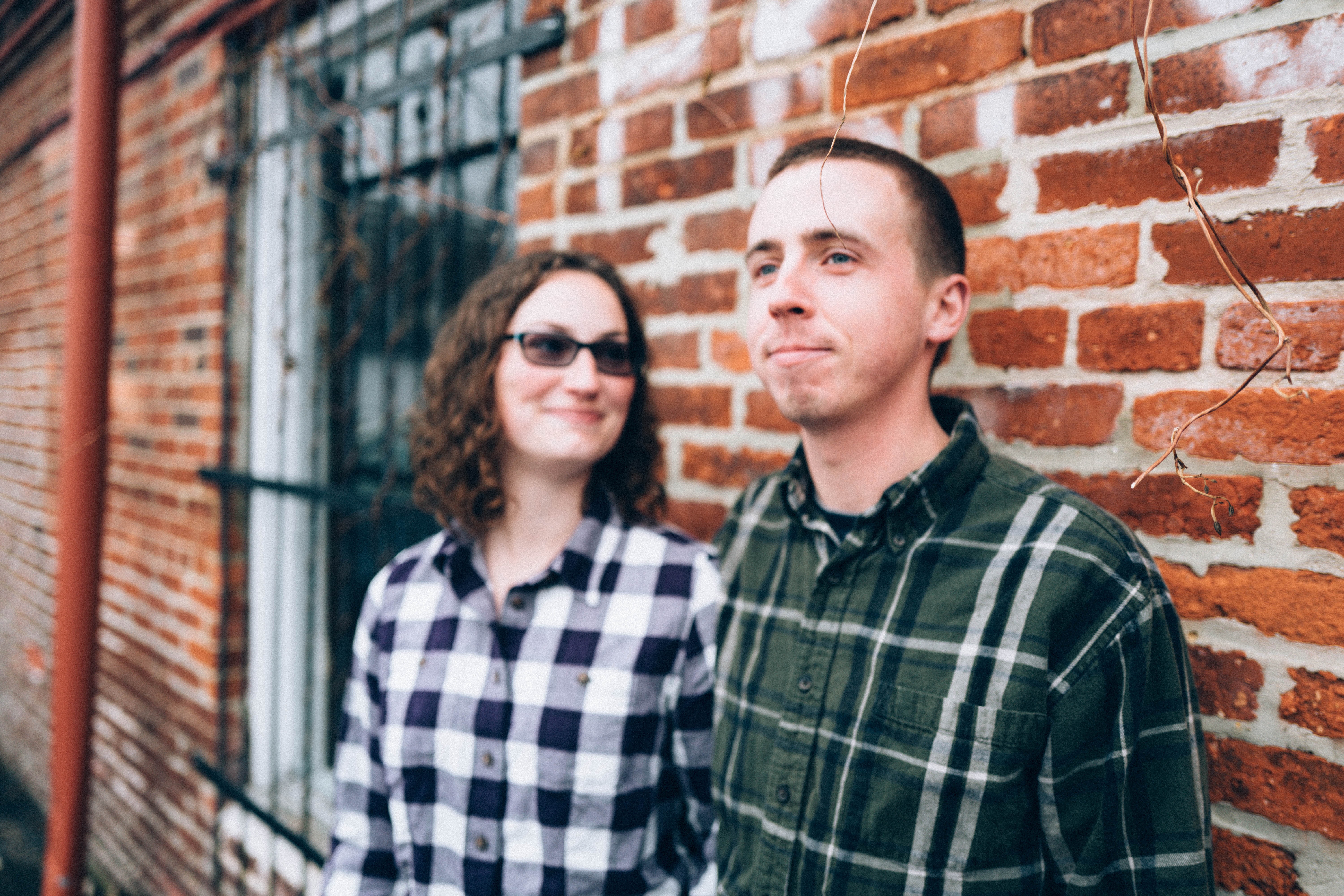 Two friends stand comfortably together against a textured brick wall, their playful expressions hinting at shared laughter and camaraderie. Soft, natural light envelops them, highlighting the intricate details of their plaid shirts and the warm tones of the brick. The composition captures a sense of ease and connection, perfectly illustrating a moment of friendship in an urban setting.