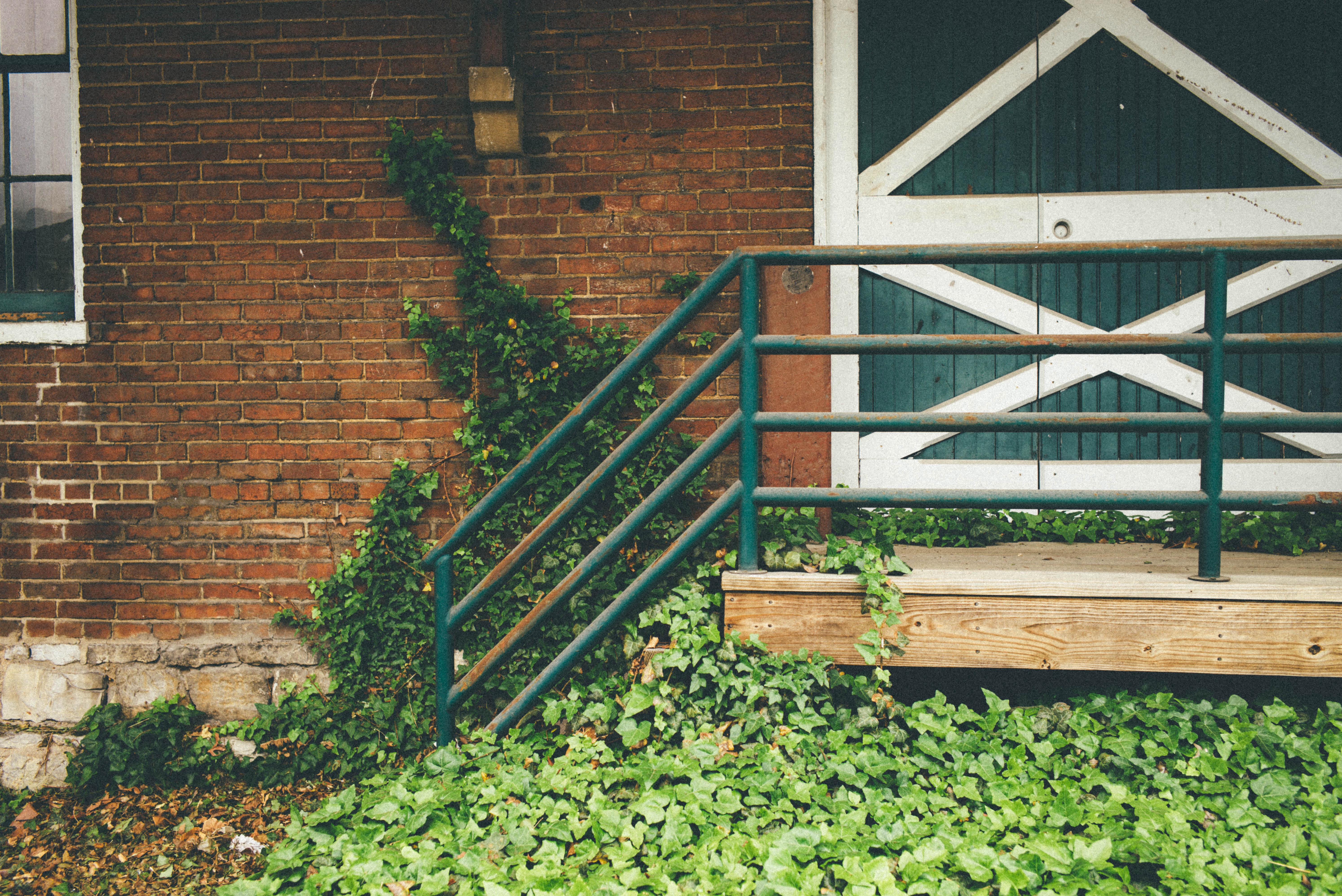 The photograph captures a weathered entrance with a green railing leading up to an old wooden door, complemented by a backdrop of rich red brick. Overgrown ivy frames the scene, creating a contrast between the structure's decay and the vibrant life around it. The soft, muted lighting evokes a sense of nostalgia and tranquility, inviting the viewer to ponder the stories behind this forgotten place.