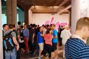 A dynamic atmosphere fills the spacious venue as groups of people engage in conversation, their diverse attire reflecting a laid-back yet professional vibe. The prominent hashtag on the wall, illuminated by soft overhead lighting, emphasizes the event's social media theme and adds a playful touch to the sophisticated gathering. Shadows and highlights create a sense of depth, inviting viewers into this collaborative scene.