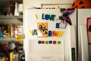 In this inviting kitchen scene, a white fridge adorned with cheerful magnetic letters spells out affectionate phrases, creating an atmosphere of warmth and nostalgia. Sunlight floods the space, illuminating a playful assortment of magnets and messages, while shadows play in the background, hinting at a lively household. The composition is lively yet intimate, capturing the essence of daily life and personal connections.