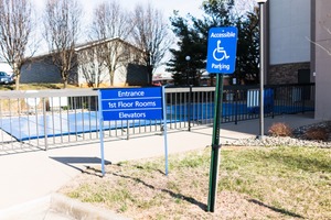 This photograph captures a serene yet utilitarian scene with clear signage directing towards accessible facilities. The bright blue signs stand out against the muted tones of the surrounding landscape, emphasizing the practicality of the location. Soft natural light filters through the branches of nearby trees, lending a calm ambiance to the structure and its welcoming message.