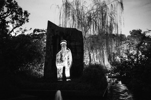 This monochromatic photograph features a striking figure seemingly carved from light, set against a dark, textured stone backdrop. The scene has a surreal and contemplative mood, enhanced by the soft glow around the figure and the surrounding lush foliage. Subtle lighting creates a contrast that emphasizes the ethereal quality of the illuminated silhouette amidst the night.