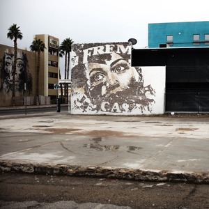 This photograph captures a striking mural on a white wall, featuring a large face and bold lettering amidst the stark urban landscape. The mood is contemplative, accentuated by the muted overcast sky and reflections in the wet pavement, emphasizing the solitude of the scene. Palm trees and nearby buildings frame the mural, creating a juxtaposition of art against a backdrop of forgotten city life.
