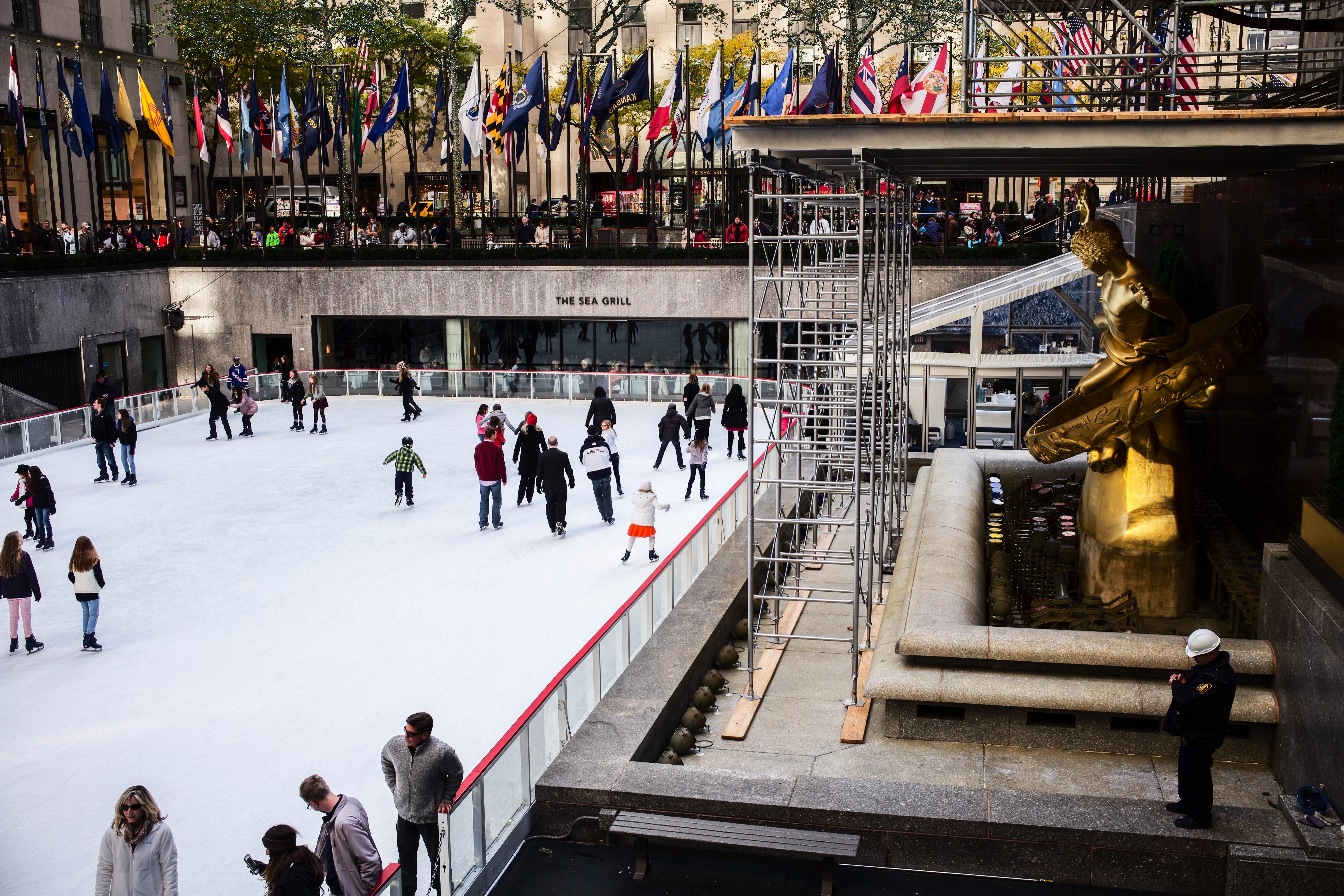 This photograph captures the lively energy of an ice skating rink surrounded by towering flags and iconic architecture. Vibrant skaters glide across the glistening ice, while the golden statue nearby adds a touch of elegance to the bustling atmosphere. The warm autumn light casts a gentle glow, enhancing the sense of joy and leisure in this urban oasis.