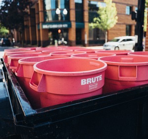 A vibrant collection of pink Rubbermaid buckets fills a black dumpster, creating a striking contrast against the subdued backdrop of a city street. The sunlight casts a soft glow on the scene, enhancing the playful yet utilitarian mood. In the periphery, blurred urban elements hint at everyday life, grounding the composition in a lively urban landscape.