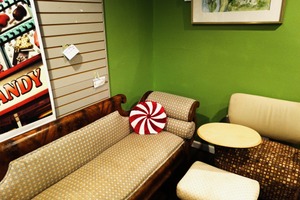 This photograph captures a charming corner of a candy-themed space, featuring a vintage wooden sofa adorned with a whimsical striped pillow. The vibrant green walls and soft lighting create a cozy and inviting atmosphere, inviting patrons to relax. A simple round table complements the eclectic seating, completing the playful yet homely vibe of the space.