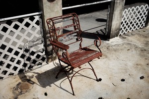 A solitary vintage chair, worn and rusted, stands against a backdrop of stark concrete and woven wood. The sunlight casts sharp shadows, enhancing the chair's intricate metalwork while evoking a sense of nostalgia and abandonment. The composition invites contemplation, suggesting forgotten stories and quiet moments of reflection.