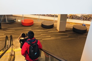 This photograph captures two individuals making their way down an escalator, evoking a sense of movement and transition. The stark contrast of the bright red jacket against the muted tones of the surroundings creates a vibrant focal point, while the soft lighting adds a calm atmosphere to the scene. The minimalist composition draws the viewer's eye along the escalator's line, inviting curiosity about what lies ahead.