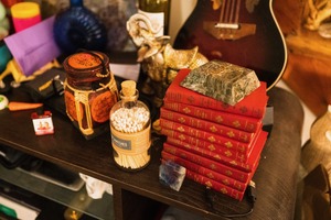 This photograph captures a cluttered tabletop filled with vibrant objects, showcasing a mix of vintage books, colorful jars, and decorative items. The warm, soft lighting creates an intimate atmosphere, inviting the viewer to explore the rich textures and colors. The composition, layered and chaotic yet harmonious, reflects a cozy and creative space.