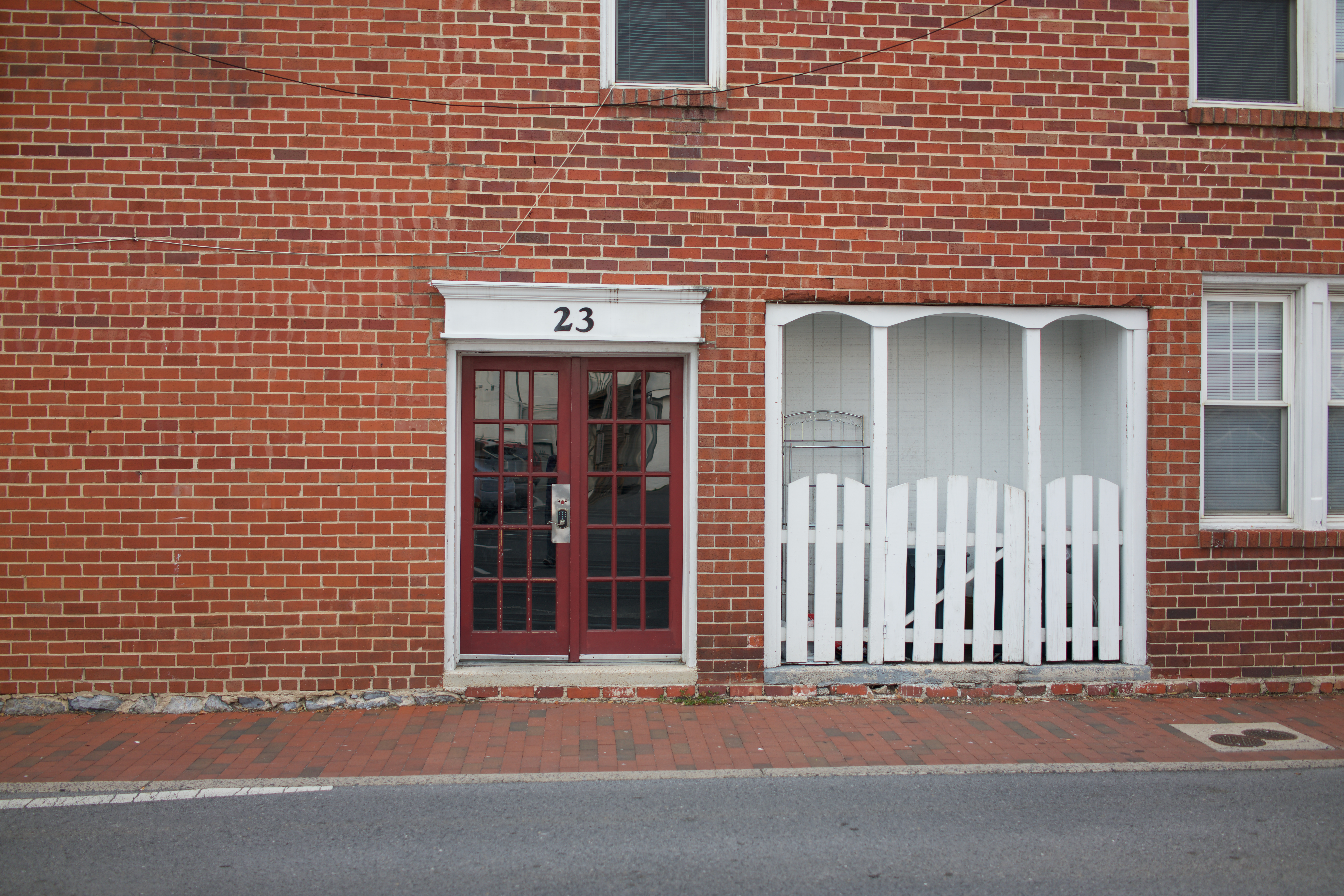 This photograph captures a subtle urban scene dominated by a stark red brick wall featuring a charming double-doored entrance. The contrasting white picket fence beside the door adds a touch of quaintness, evoking a sense of nostalgia. The muted lighting enhances the calm and introspective mood, inviting viewers to ponder the stories behind this everyday façade.
