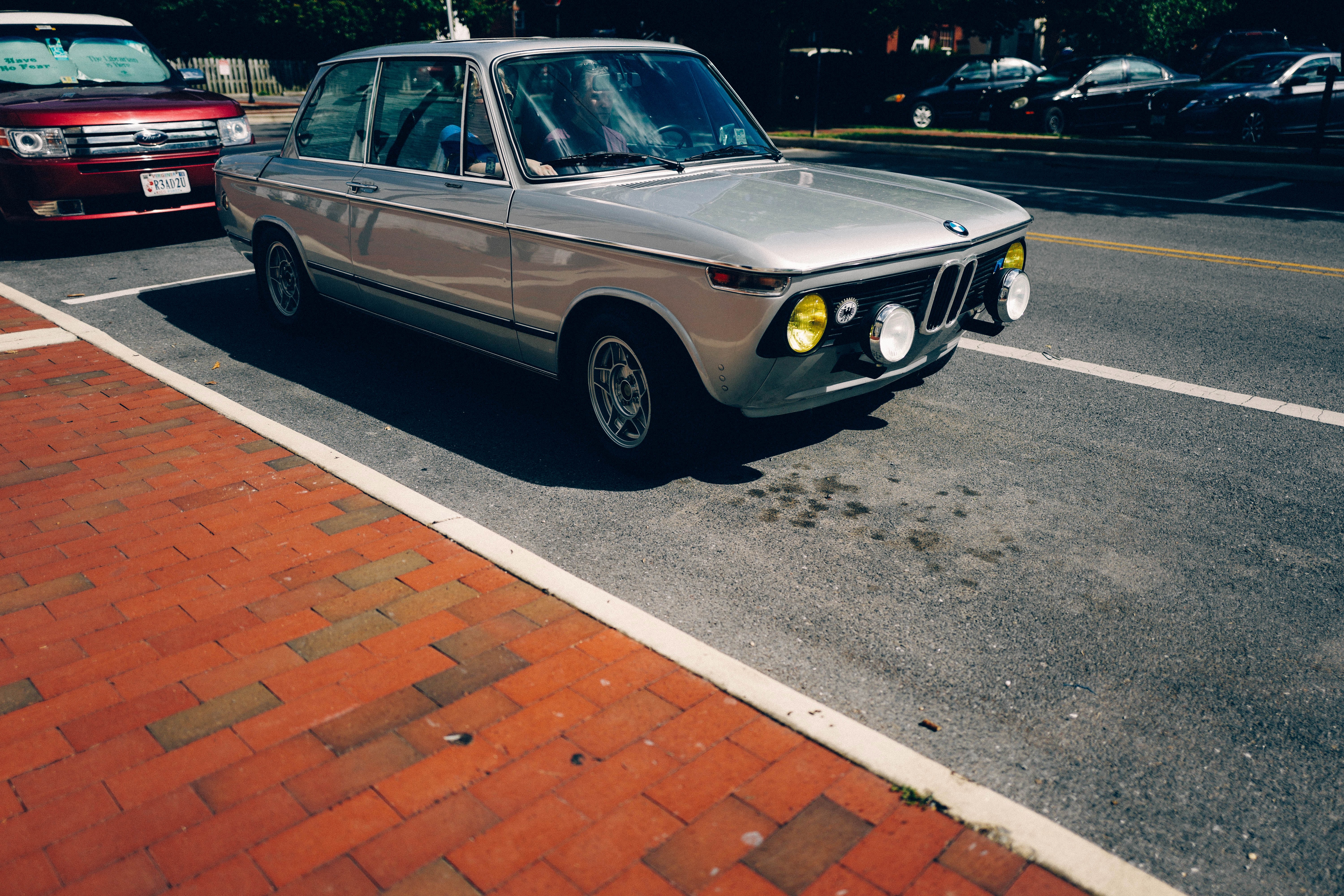 A silver BMW gracefully navigates a sunlit street, highlighting its classic design with prominent round headlights. The vibrant contrast of the car against the warm brick pavement evokes a sense of nostalgia and charm. The scene captures a moment of urban life, infused with vibrant colors and inviting sunlight, suggesting a carefree atmosphere.