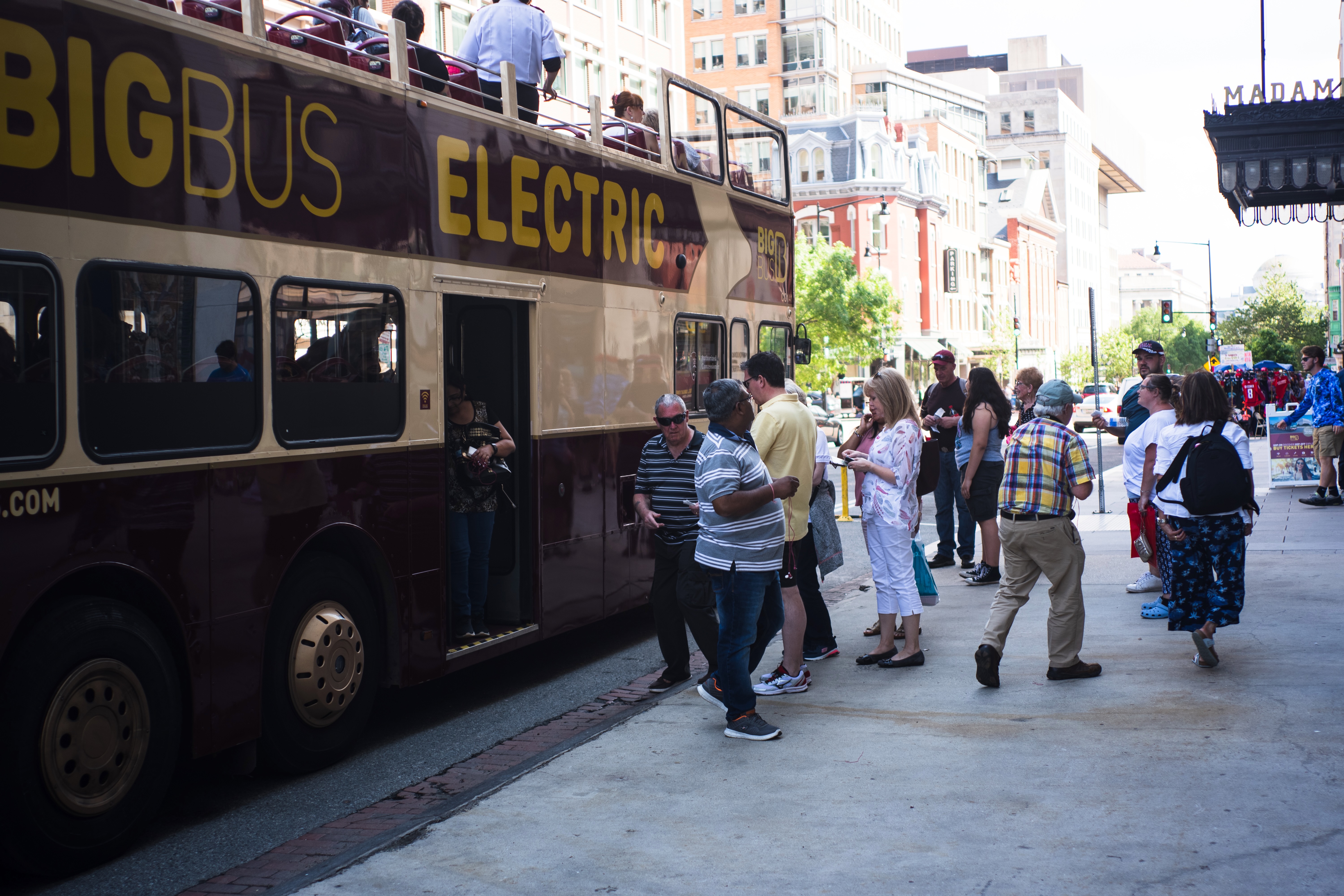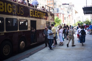 In the bustling cityscape, a vibrant electric tour bus attracts a mixed crowd of eager tourists. The warm daylight illuminates the scene, creating an inviting atmosphere as people congregate to embark on their urban exploration. The composition captures a moment of anticipation, blending the energy of city life with the excitement of adventure.