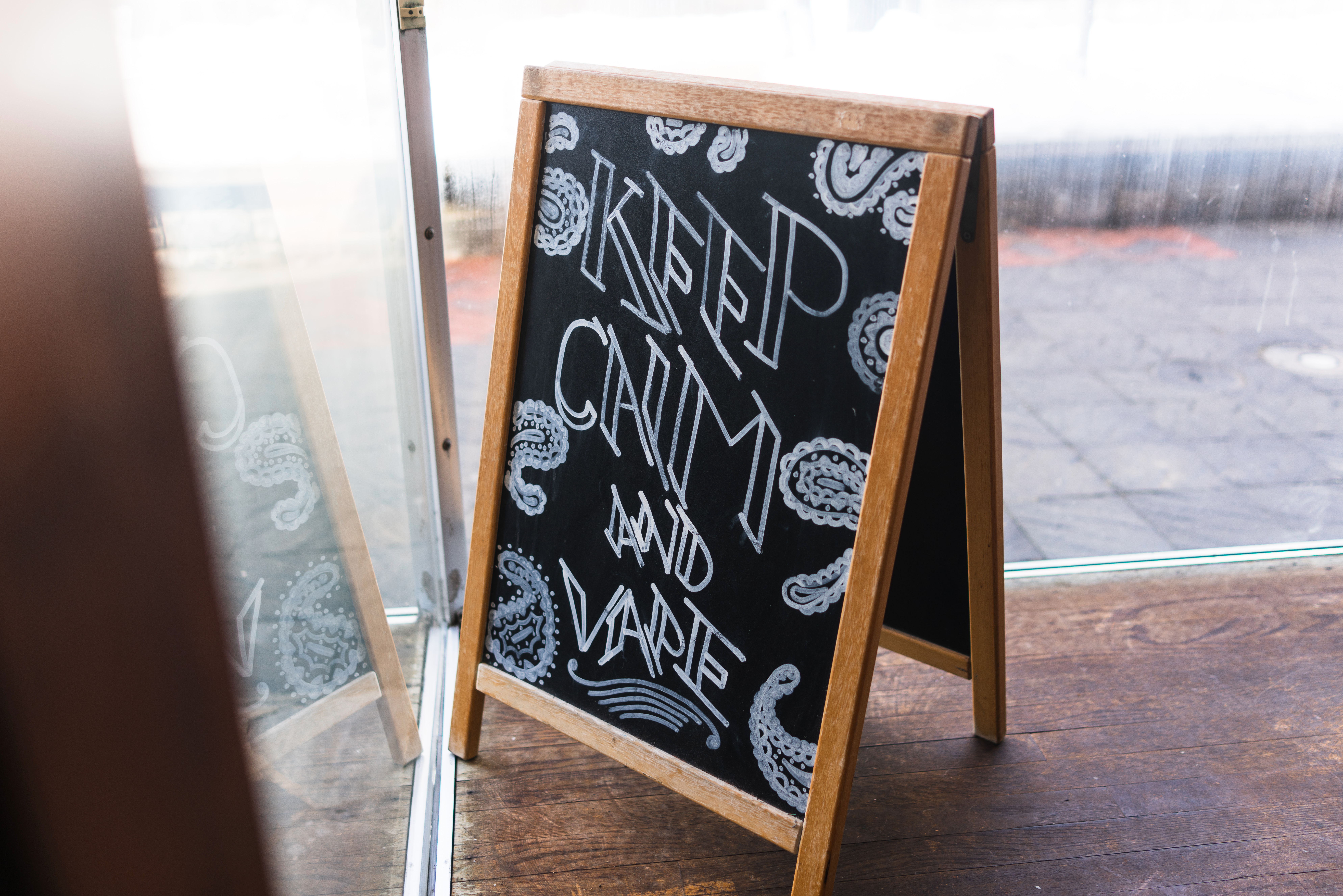 The photograph features a rustic wooden chalkboard sign displaying the phrase 'KEEP CALM AND VAPE', framed by decorative patterns. Soft, natural light filters through, casting a warm glow on the textured surface of the sign and enhancing the overall inviting atmosphere. The angle and positioning create a sense of intimacy, drawing the viewer in with a cozy, laid-back vibe.