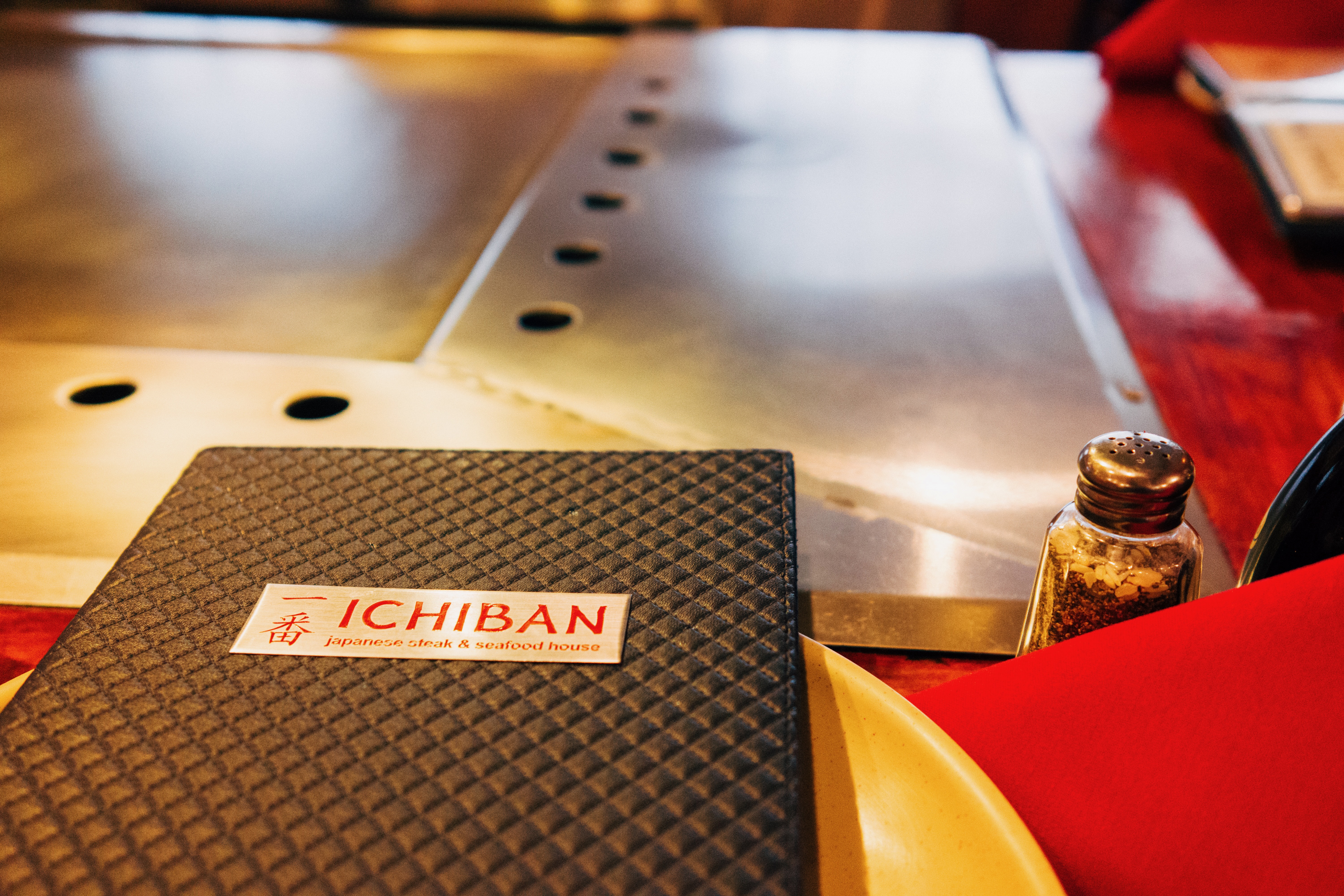 A close-up of a sleek black menu from Ichiban rests on a polished steel table, hinting at the excitement of an upcoming dining experience. The warm reflections on the metal evoke a cozy yet vibrant atmosphere, while scattered condiments and traditional table settings enhance the anticipation of a shared meal. The composition draws the eye inward towards the cooking surface, inviting diners to immerse themselves in the culinary spectacle ahead.