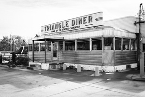 The photograph captures the vintage charm of the 'Triangle Diner,' showcasing its iconic silver façade and bold signage. Set in monochrome, the composition evokes a sense of nostalgia, while soft, diffused lighting enhances the diner’s inviting atmosphere. The scene is punctuated by the presence of a lone figure outside, hinting at stories and memories woven into the fabric of this timeless eatery.