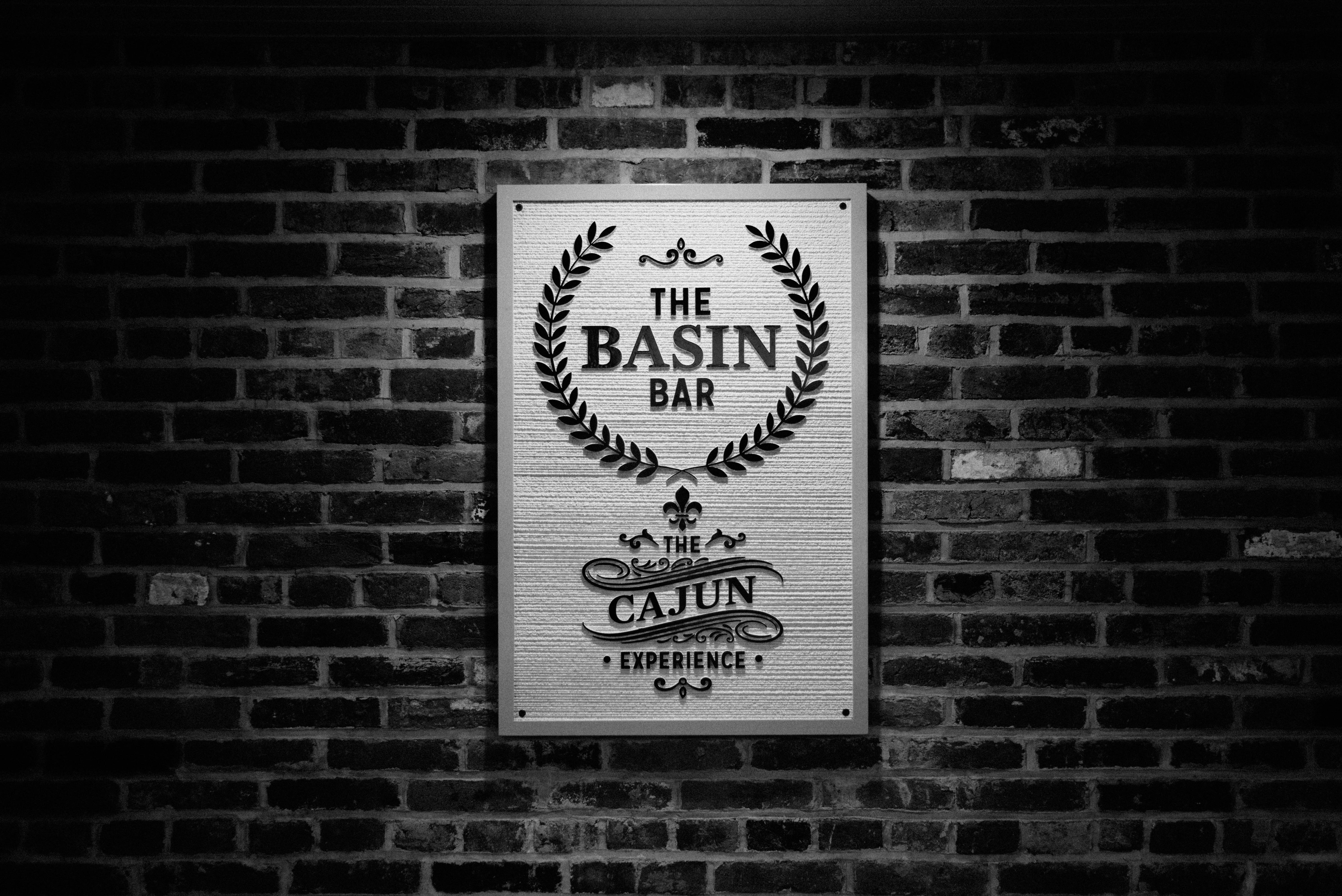The photograph captures a stylish sign for 'The Basin Bar' against a rustic brick wall, evoking a sense of warmth and nostalgia. The use of black and white enhances the textures of both the sign and the bricks, creating a moody atmosphere that invites curiosity. Elegant fonts and decorative elements suggest a rich cultural experience, with a hint of Cajun flair.