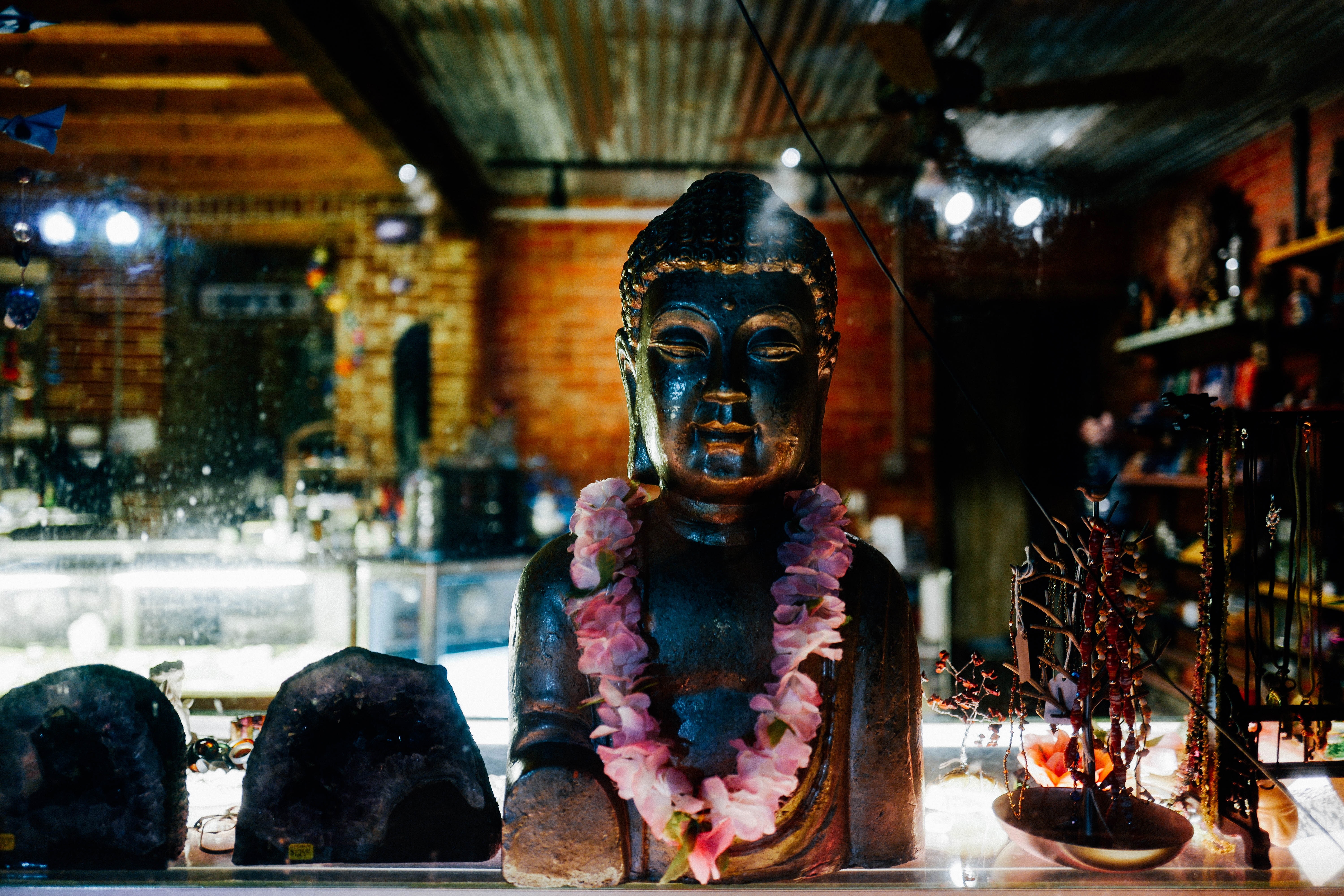 A serene Buddha statue adorned with a colorful floral lei sits prominently behind a glass display, reflecting the warm ambient light of the shop. The rich textures of the wooden interior and the contrasting dark stones create a cozy, inviting atmosphere. Soft lighting accentuates the tranquility of the subject, evoking a sense of peace amidst the bustling surroundings.