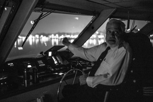 In this moody black-and-white photograph, a captain steers a vessel through the darkness, his expression a mix of concentration and urgency. The soft glow from the control panel contrasts with the shadowy surroundings, enhancing the intimate yet tense atmosphere of night navigation. Reflections of distant city lights shimmer on the water, hinting at a vibrant world beyond the quiet confines of the bridge.