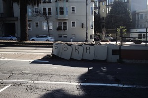 In this urban scene, concrete barriers marked with '50 KM' contrast starkly against the muted tones of the buildings behind. The play of light and shadow creates a sense of depth, adding an air of loneliness to the otherwise bustling environment. The composition, with its strong horizontal lines and minimal distractions, evokes a feeling of stillness amidst city life.