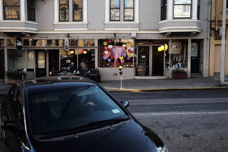 The photograph captures a charming street scene, showcasing a cafe adorned with colorful heart decorations that evoke a warm, inviting atmosphere. A sleek black car occupies the foreground, grounding the image in a moment of urban life, while soft natural light enhances the cozy vibe of the establishment. The overall composition harmonizes the bustling street with the intimate ambiance of the cafe, inviting viewers to pause and appreciate the scene's simplicity.