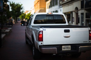 This photograph captures a white pickup truck parked on a quiet, tree-lined street, emanating a sense of stillness and charm. The soft, diffused light casts gentle shadows, enhancing the serene mood of the urban scene as it invites onlookers to reflect on the simple beauty of everyday life. The composition draws the eye along the road, leading to a hint of distant buildings, creating a narrative of exploration and calm.