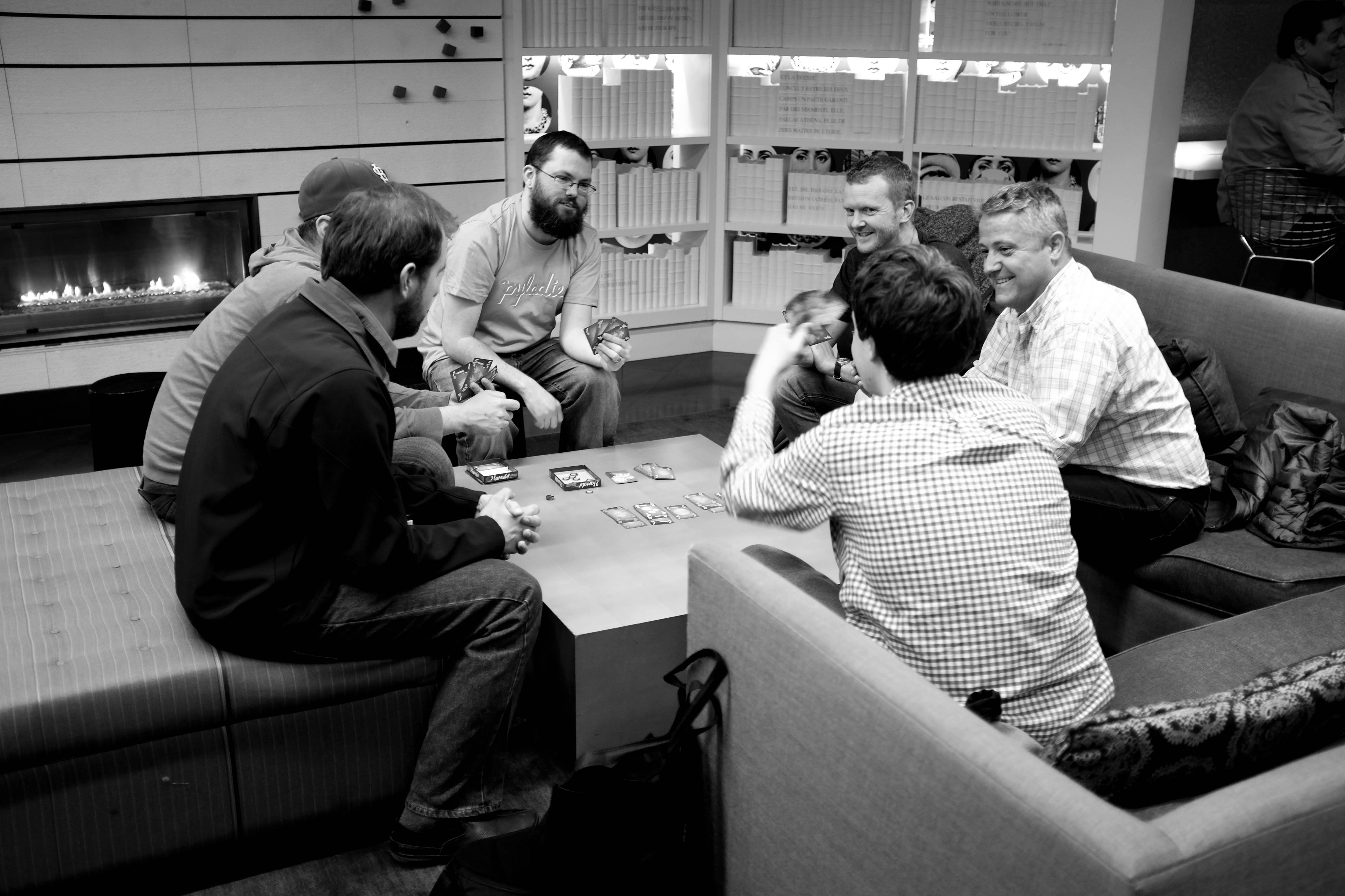 In a cozy, warmly lit lounge, a group of six men is immersed in a card game, their focused expressions and animated gestures creating a lively atmosphere. The black and white composition highlights the interplay of light and shadow, enhancing the sense of camaraderie and excitement among the players. The soft glow of the fireplace in the background adds a subtle warmth, inviting viewers into this intimate gathering.