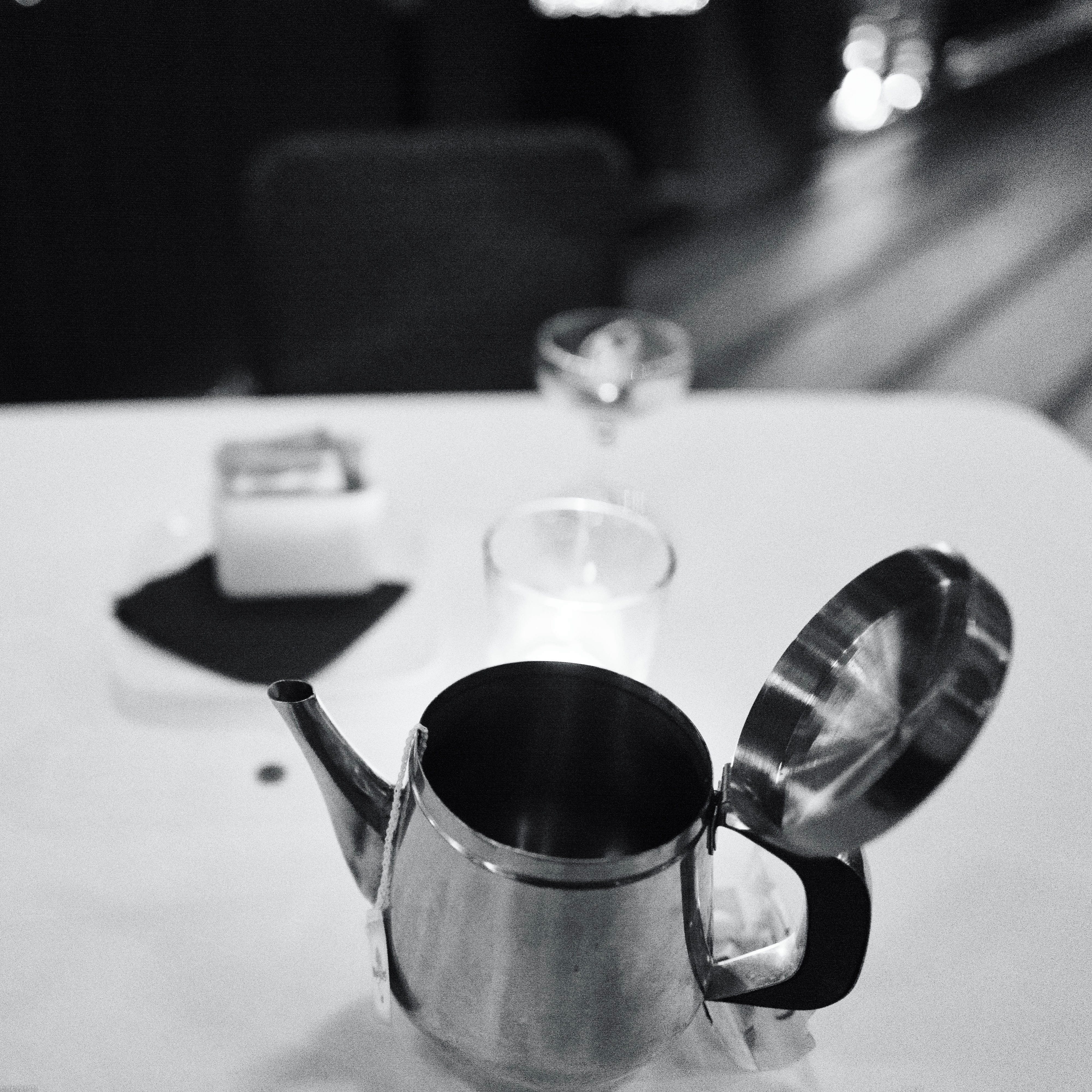 The photograph captures a close-up view of a polished metallic teapot with its lid slightly ajar, set against a moody backdrop. Soft, ambient lighting bathes the scene, creating a sense of intimacy and warmth, while the blurred edges evoke a feeling of tranquility and contemplation. The arrangement of the teapot alongside delicate glassware and a flickering candle adds elegance to the understated composition.