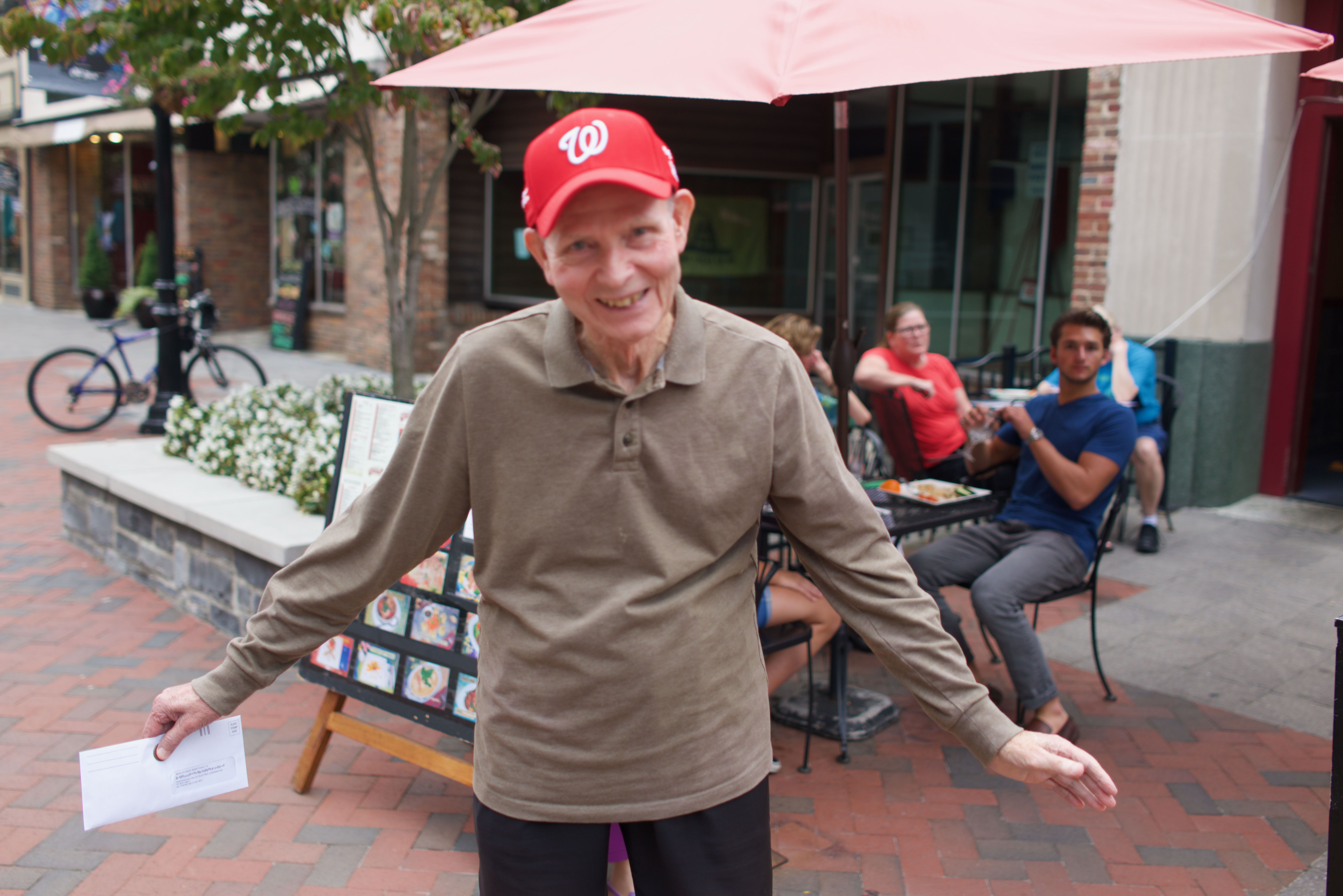 In this lively street scene, an elderly man beams with delight, clad in a vibrant red cap and casual attire. The warm, inviting atmosphere is enhanced by soft, diffused lighting filtering through the surrounding umbrellas, contrasting with the relaxed enjoyment of others nearby. His open arms and genuine smile evoke a sense of joy and spontaneity, bringing a timeless charm to the moment.