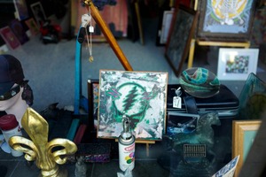 This photograph captures a vibrant assortment of eclectic items displayed behind glass, inviting curiosity and nostalgia. The soft natural lighting highlights the textures and colors of the objects, from a striking painted canvas to various trinkets, creating a warm, intriguing atmosphere. The composition draws the eye through layers of detail, suggesting a story waiting to be uncovered within each handmade piece.