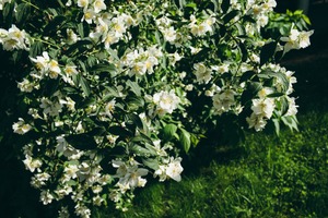 This photograph captures a lush cluster of white flowers set against a vibrant green background. The sunlight filters through the leaves, creating a warm and inviting mood that celebrates the beauty of nature in full bloom. The composition draws the eye to the delicate petals, emphasizing their intricate details and the tranquil ambiance of a blooming garden.