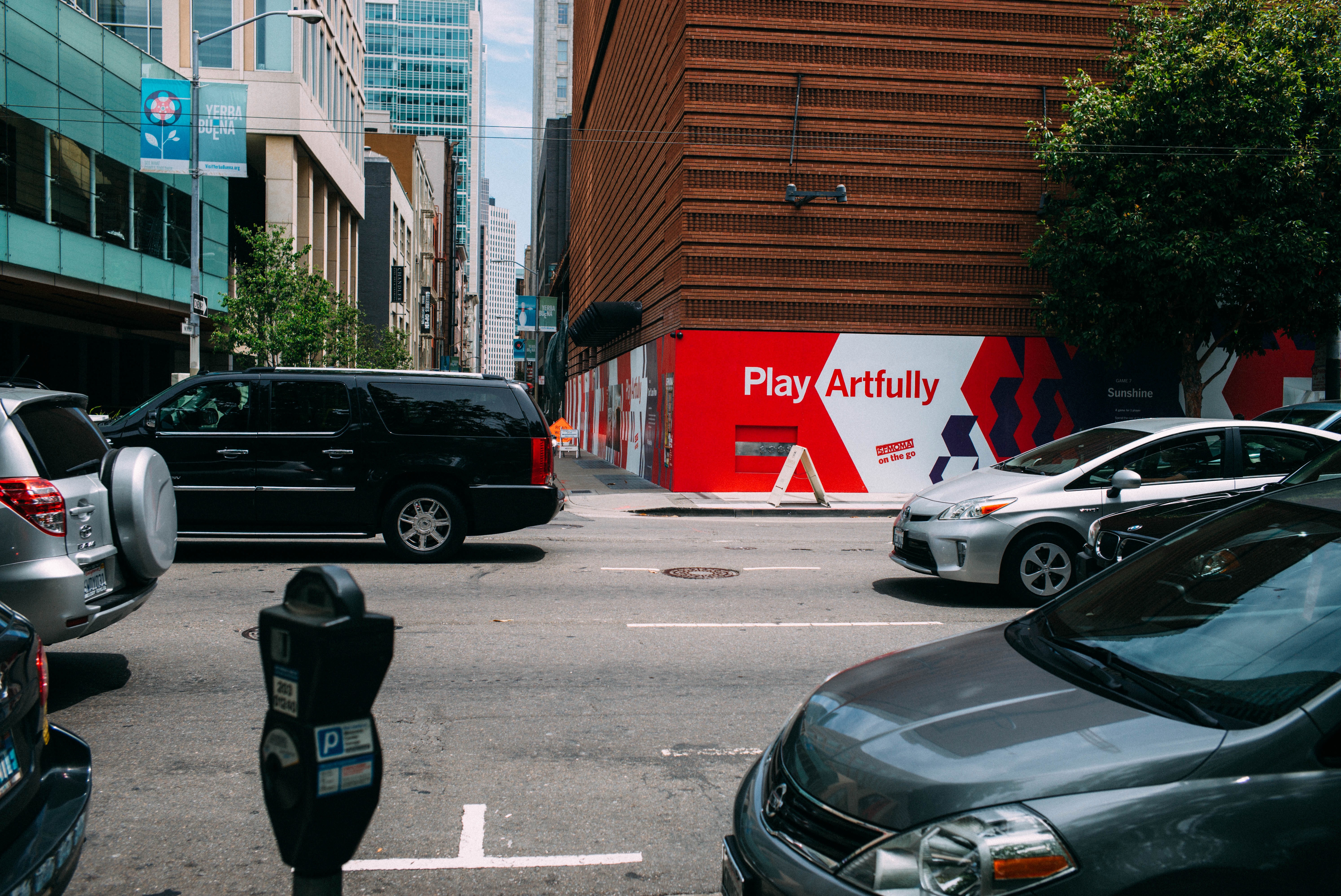 The photograph captures a busy city street, bustling with vehicles navigating their way past a vibrant mural that boldly declares 'Play Artfully.' The interplay of natural light and the colorful artwork contrasts with the muted tones of the cars and buildings, creating a dynamic yet serene urban atmosphere.