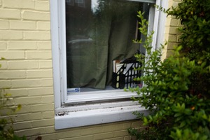 The photograph captures a cozy window framed by lush greenery, hinting at a serene domestic space within. Soft natural light filters through the curtains, suggesting warmth and familiarity, while a hint of everyday life is revealed by the items nestled behind the glass. The muted color palette of the yellow wall and verdant foliage evokes a sense of tranquil isolation.