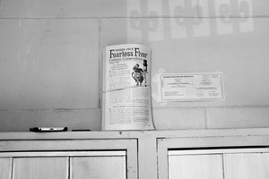 In this black-and-white photograph, a Trader Joe's flyer titled 'Fearless Flyer Culinary Compendium' clings to the wall, its playful design offering a contrast to the austere setting. The muted tones and soft shadows create an introspective mood, inviting the viewer to reflect on the simplicity of everyday moments. An accompanying business registration certificate hints at underlying layers of community and commerce, grounding the image in a sense of place.