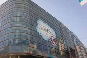 This photograph captures the sleek, modern facade of a high-rise building prominently displaying the Salesforce logo. The glass exterior reflects the clear blue sky, creating a bright and airy mood, while the unique architectural contours add an element of dynamism to the composition.