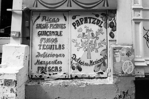 This black-and-white photograph showcases a vibrant food advertisement plastered on a rustic wall, celebrating the flavors of Mexican cuisine. The bold lettering and playful illustrations contrast against the peeling paint, evoking a sense of authenticity and nostalgia. The composition draws the eye to the lively subject, while the muted tones create a mood of urban charm and warmth.