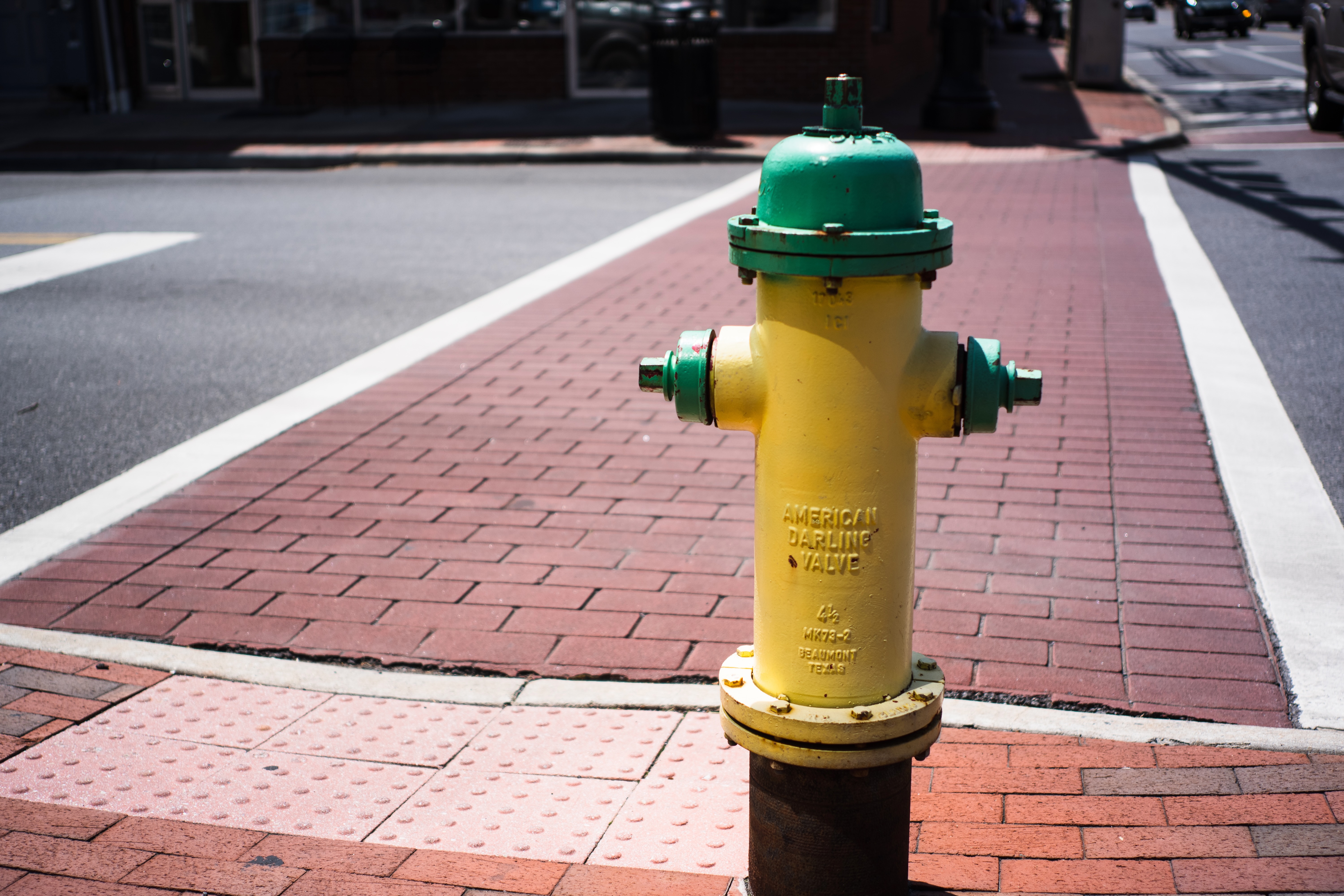 A bright yellow fire hydrant stands prominently at the corner of a bustling street, its vibrant hues contrasting against the muted tones of the pavement. Sunlight casts soft shadows, highlighting the hydrant's rounded contours and embossed details, adding a touch of urban charm. The composition invites viewers to appreciate the often-overlooked elements of city life, evoking a sense of familiarity and warmth in the everyday landscape.