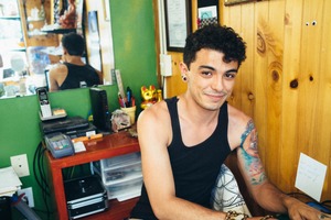 The photograph captures a young man sitting comfortably in a vibrant workspace, adorned with eclectic decor and framed prints. His warm smile and relaxed demeanor exude a sense of creativity and openness, while soft, natural light highlights his features against the lively green wall. The reflection in the mirror adds depth, inviting viewers to imagine the stories held within this inviting environment.