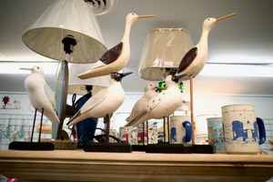 A charming collection of decorative bird sculptures stands proudly on a wooden shelf, their charming shapes and colors catching the eye. Soft lighting filters through, creating a warm and inviting atmosphere, while the playful arrangement is complemented by the backdrop of eclectic home items. The scene exudes a sense of nostalgia and whimsy, inviting viewers to appreciate the artistry in everyday objects.