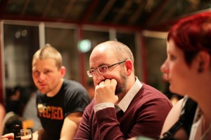In a warmly lit setting, three individuals engage in a moment of reflection amidst a casual gathering. The soft focus on their faces highlights the varied expressions of contemplation and connection, creating an intimate atmosphere. The contrasting colors of their clothing and the blur of the background enhance the sense of depth in the composition.