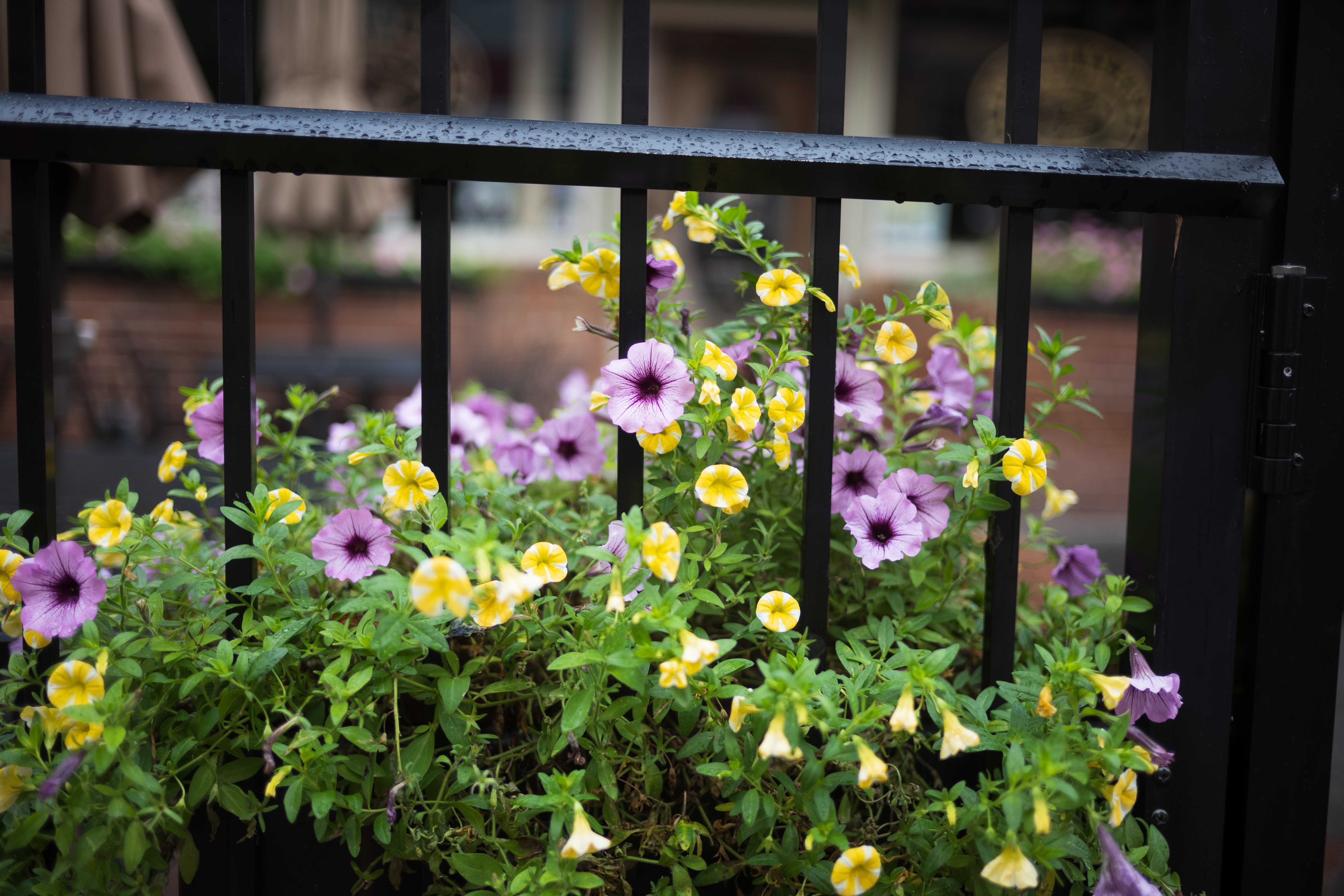 Vibrant clusters of purple and yellow flowers bloom abundantly, their cheerful colors contrasting with the sharp black bars that frame them. Soft, diffused lighting enhances the delicate petals, while the slight sheen from recent rain lends a fresh, serene atmosphere. This composition evokes a sense of beauty and resilience, suggesting life thriving even in confined spaces.